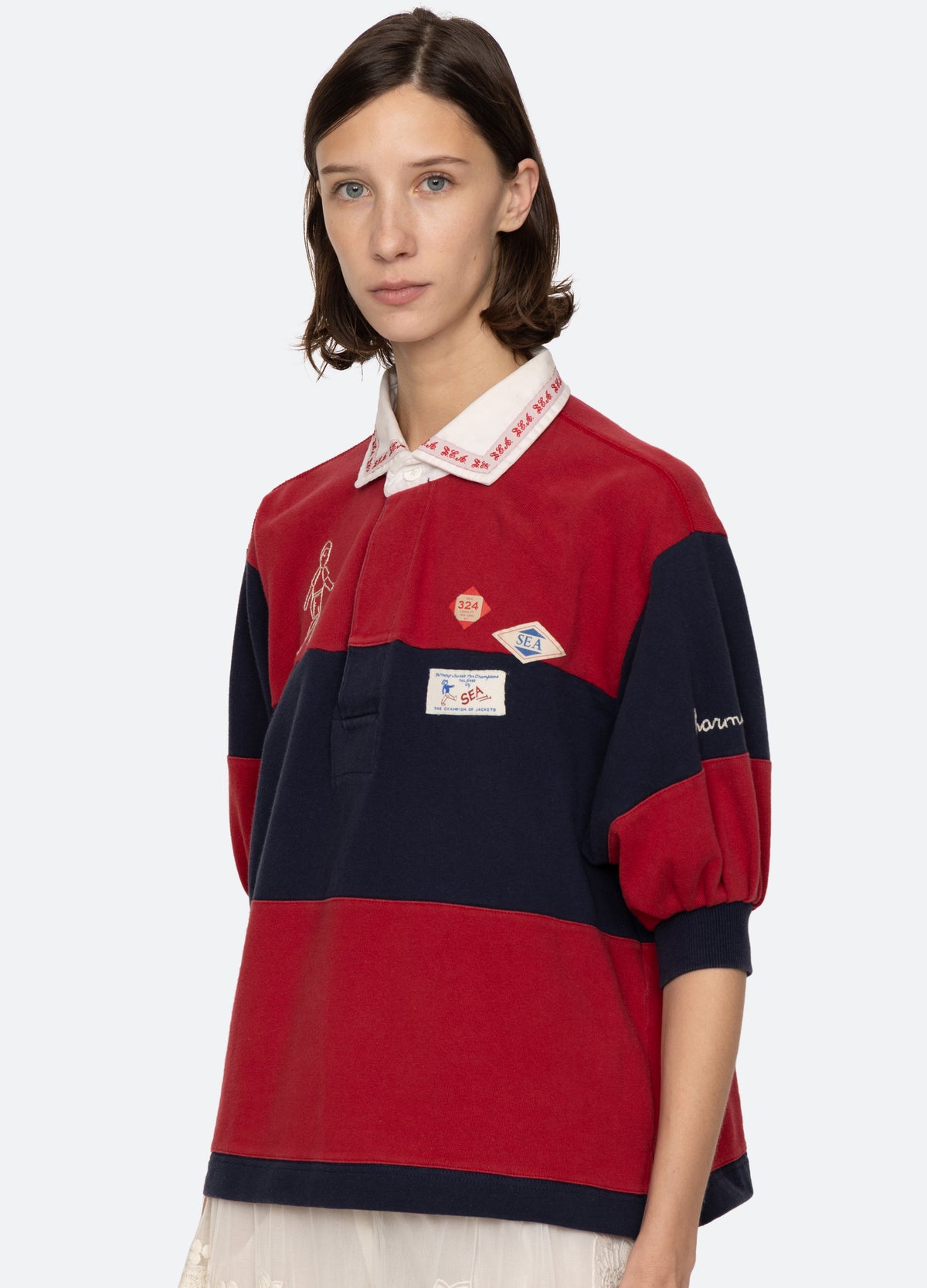 The Carolyn shirt is a workwear-inspired rugby top featuring short puff sleeves, custom Sea labels, and intricate embroidered detailing. Designed with a button-front closure, this versatile piece blends utility with feminine charm, making it a unique addition to any wardrobe.