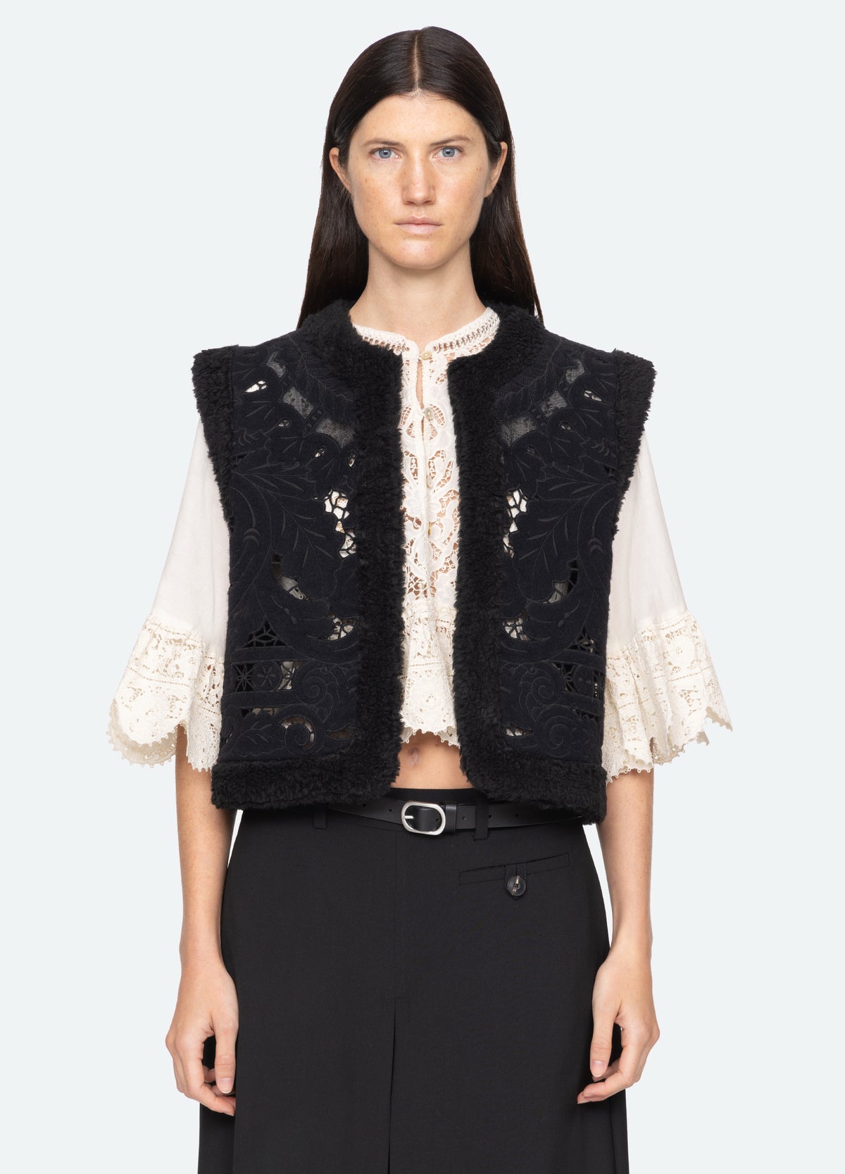 The Ceci embroidered vest features beautiful floral embroidery with delicate cut-out detailing. The shearling edge trim adds a cozy, luxe touch, elevating this vest to a statement piece for any wardrobe.