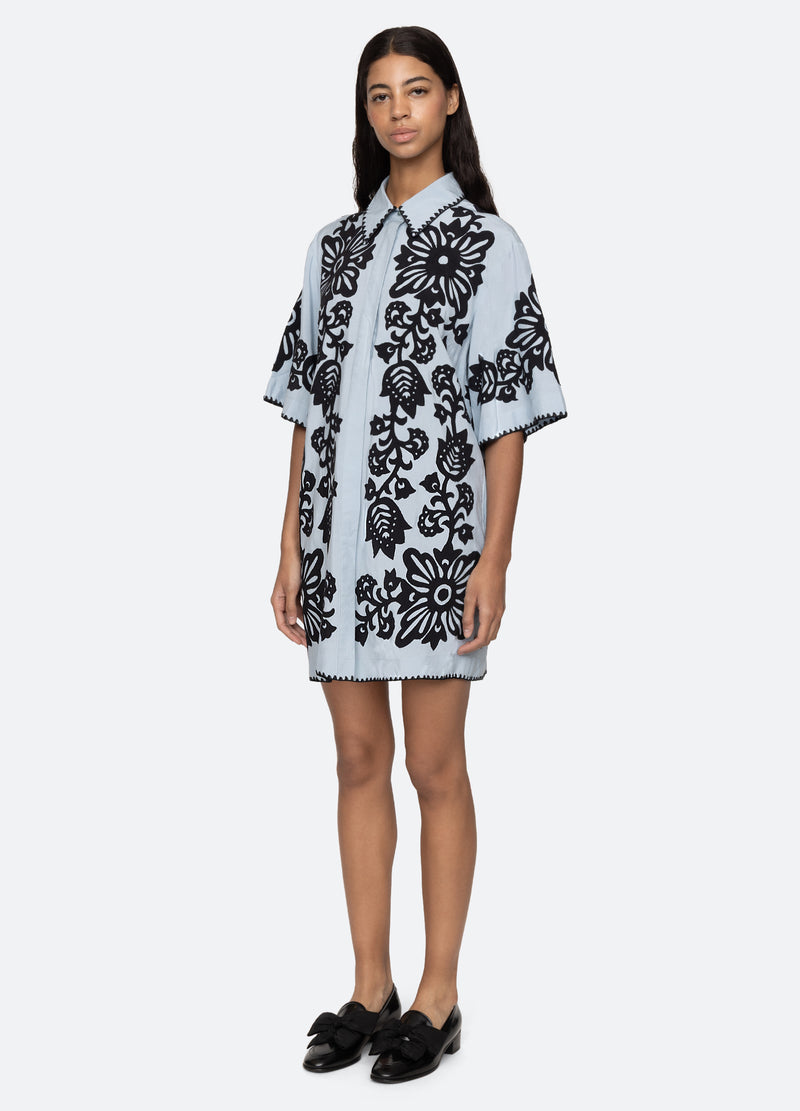 The Liliana applique shirt dress features a sophisticated fusion of classic tailoring and intricate design. This dress features detailed crochet trim and a removable belt, adding a unique touch to its mini silhouette. Designed with a button-front closure, it offers both style and functionality.