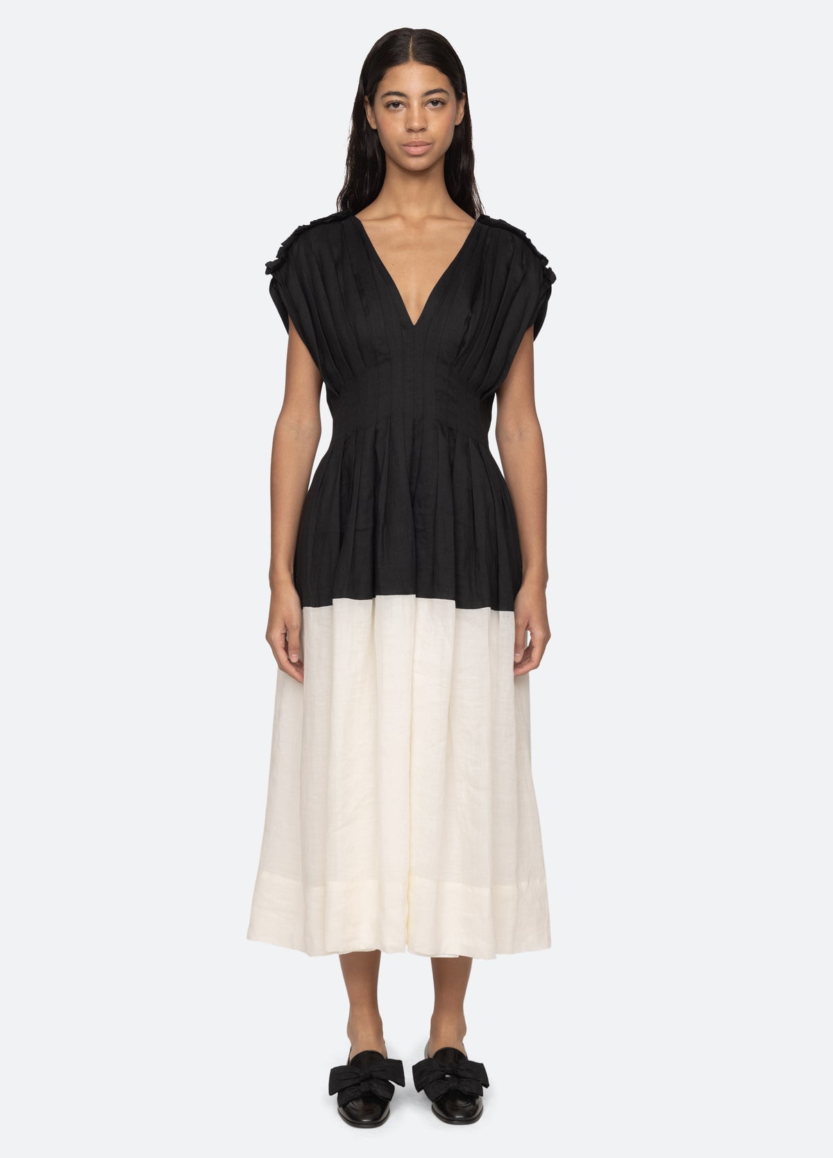 The Nicola dress features a deep v-neckline, pleated detailing and midi silhouette.